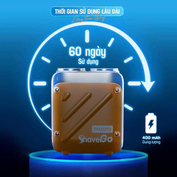 Máy được trang bị Pin sạc 400mAh bền bỉ, cho thời gian sử dụng dài, tiện lợi mang theo khi đi làm, đi công tác hoặc du lịch. Masuto ShaverGo không chỉ là máy cạo râu, mà còn là công cụ giúp bạn luôn giữ vẻ ngoài gọn gàng, tự tin trong mọi tình huống.